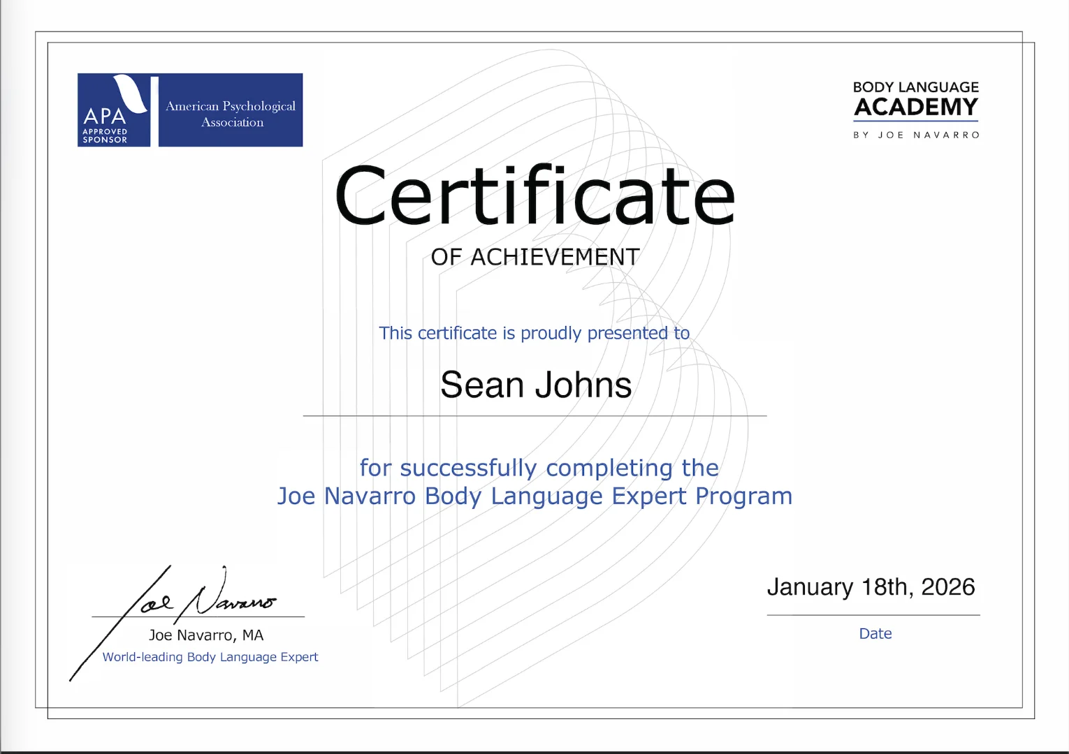 I'm certified by Joe Navarro (former FBI), the Paul Ekman Group in micro expressions, and qualified as an NLP Practitioner through the AEPNL. Then I built BodyLytics to bring that same expertise to anyone who wants to communicate better — whether you're an individual professional or a team of fifty.