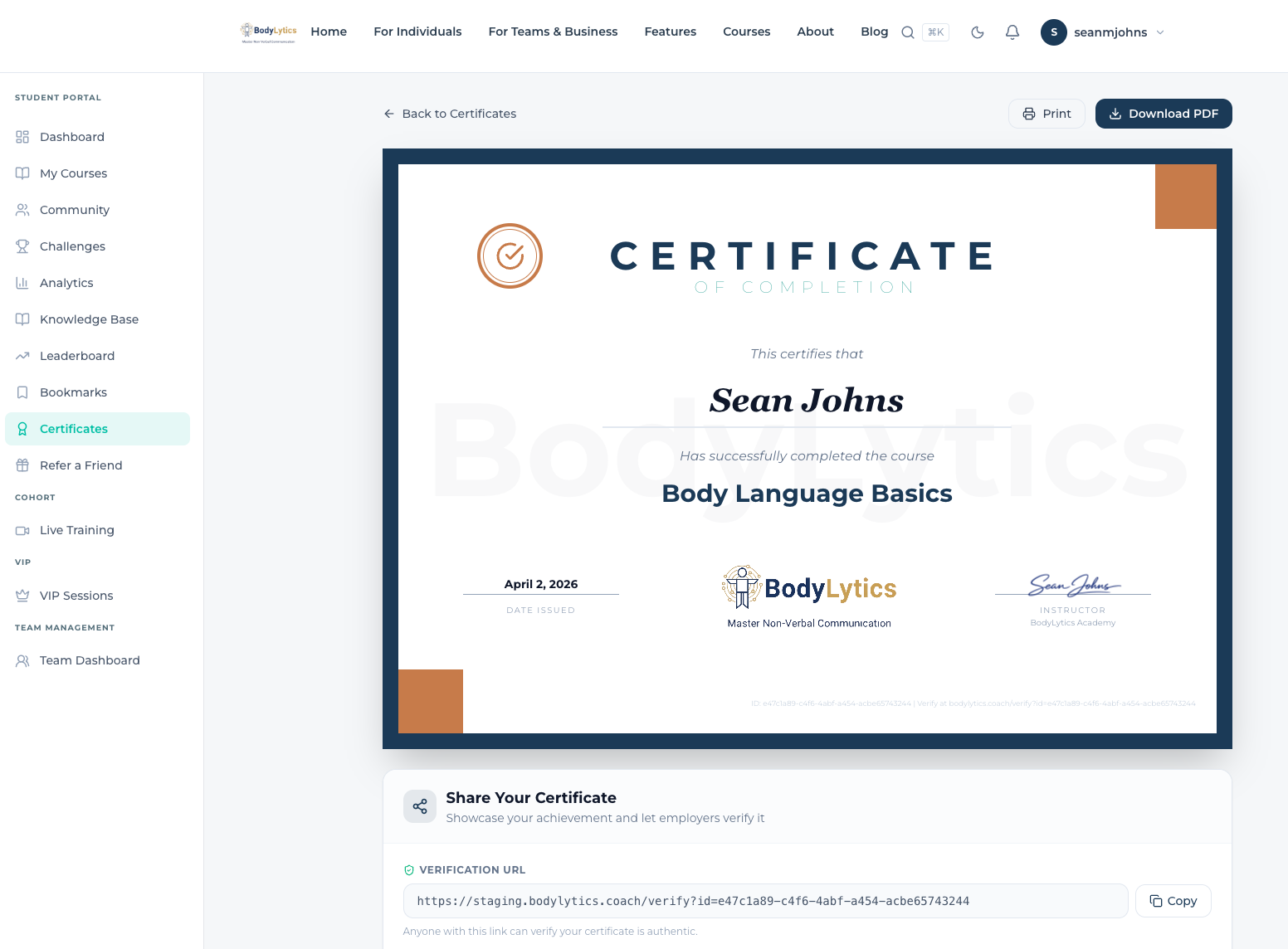 When you complete 100% of a course (every lesson marked as complete), you'll receive a course completion celebration and a personalised certificate. The certificate includes your name, the course title, and the completion date. You can download it as a PDF or share it directly to LinkedIn.